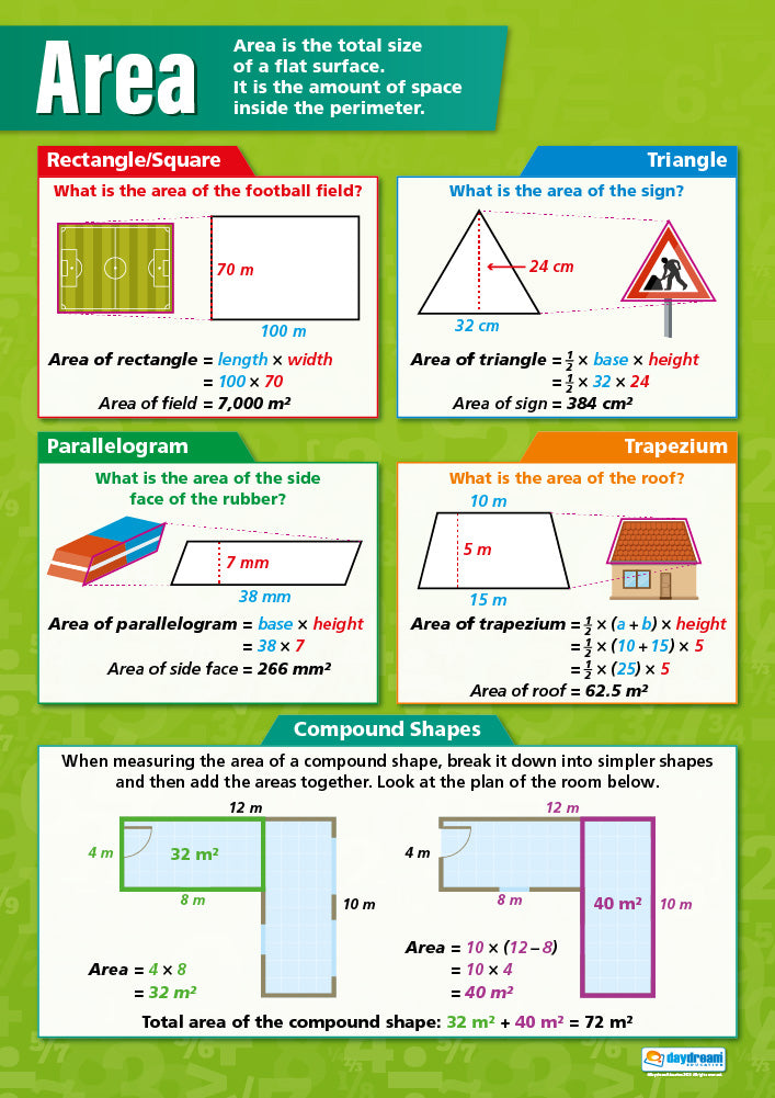 - Detailed diagrams:Ā Vibrant illustrations bring rectangles,Ā squares,Ā triangles,Ā parallelograms,Ā trapeziums,Ā and even compound shapes to life,Ā showing exactly how to apply the formulas.
