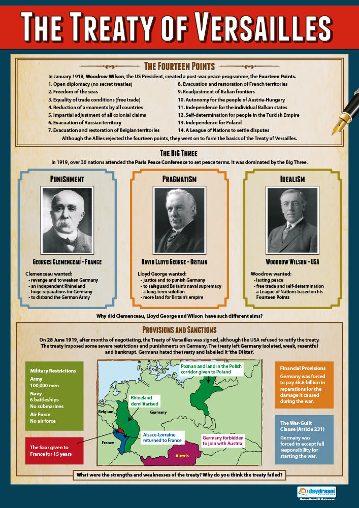 - The Treaty of Versailles: Uncover the terms of the peace settlement that formally ended the war, analysing its impact on Germany and the potential seeds for future conflict.