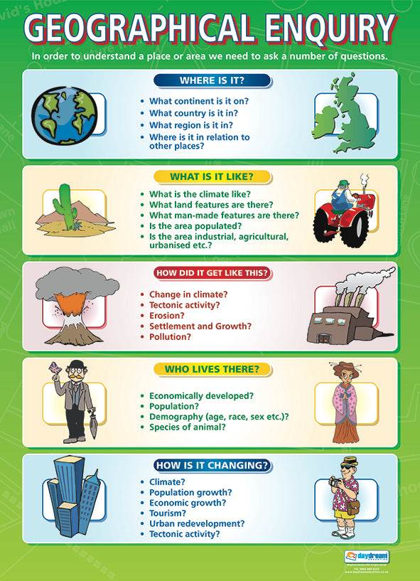 - Geographical Enquiry:Ā Develop essential geographical research skills with this engaging poster. It provides a visual framework for students to formulate questions, gather information, and analyse geographical data.