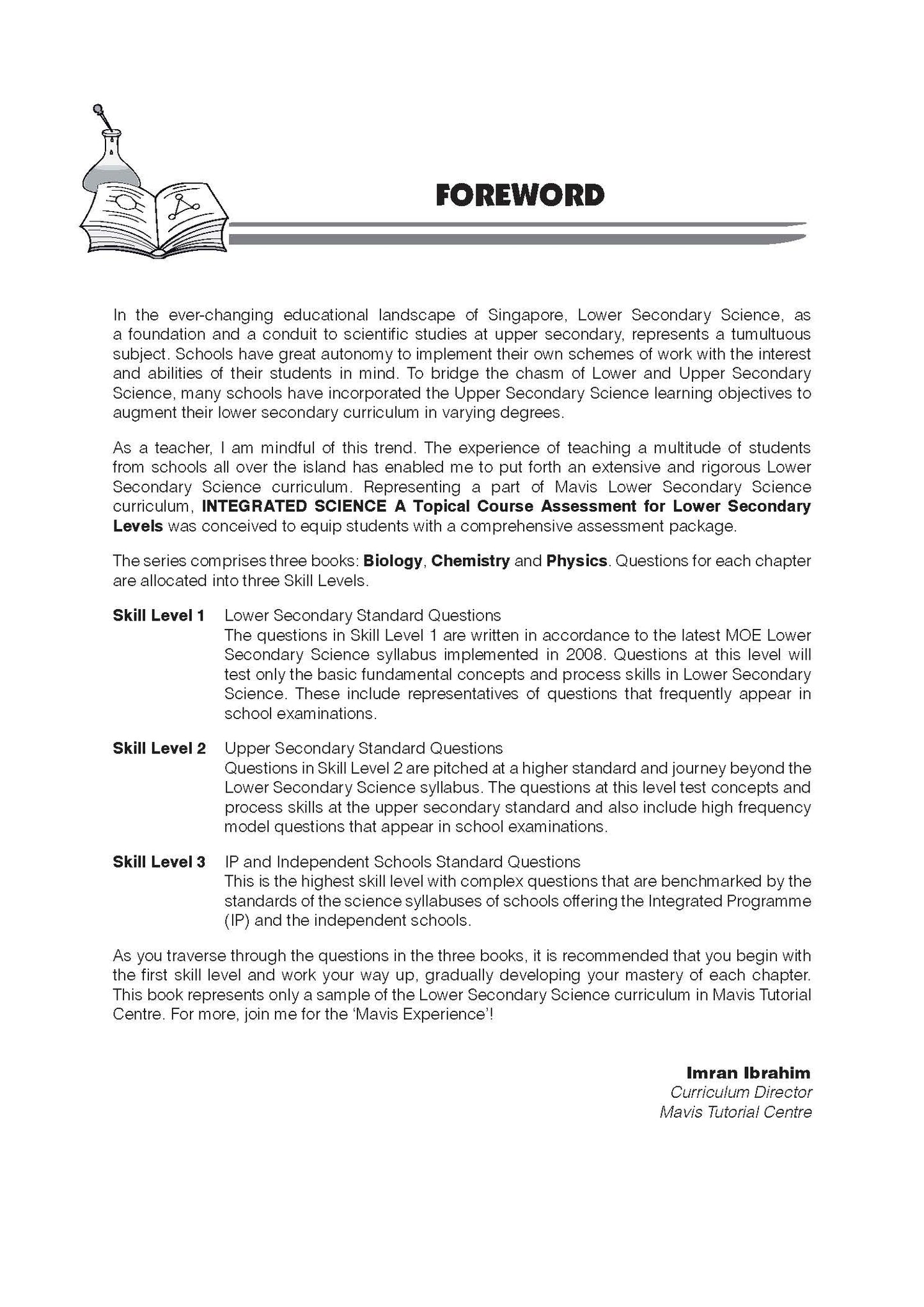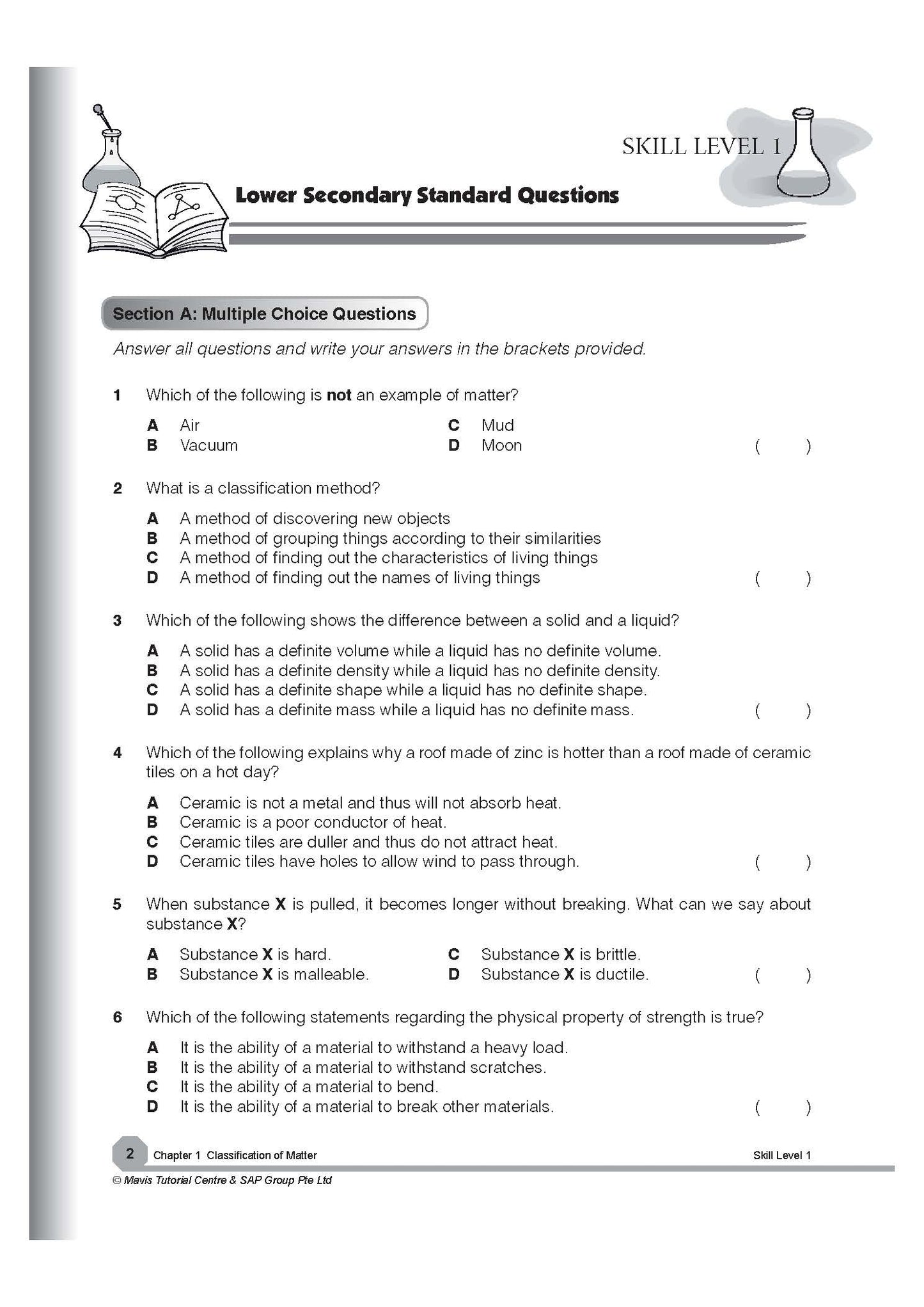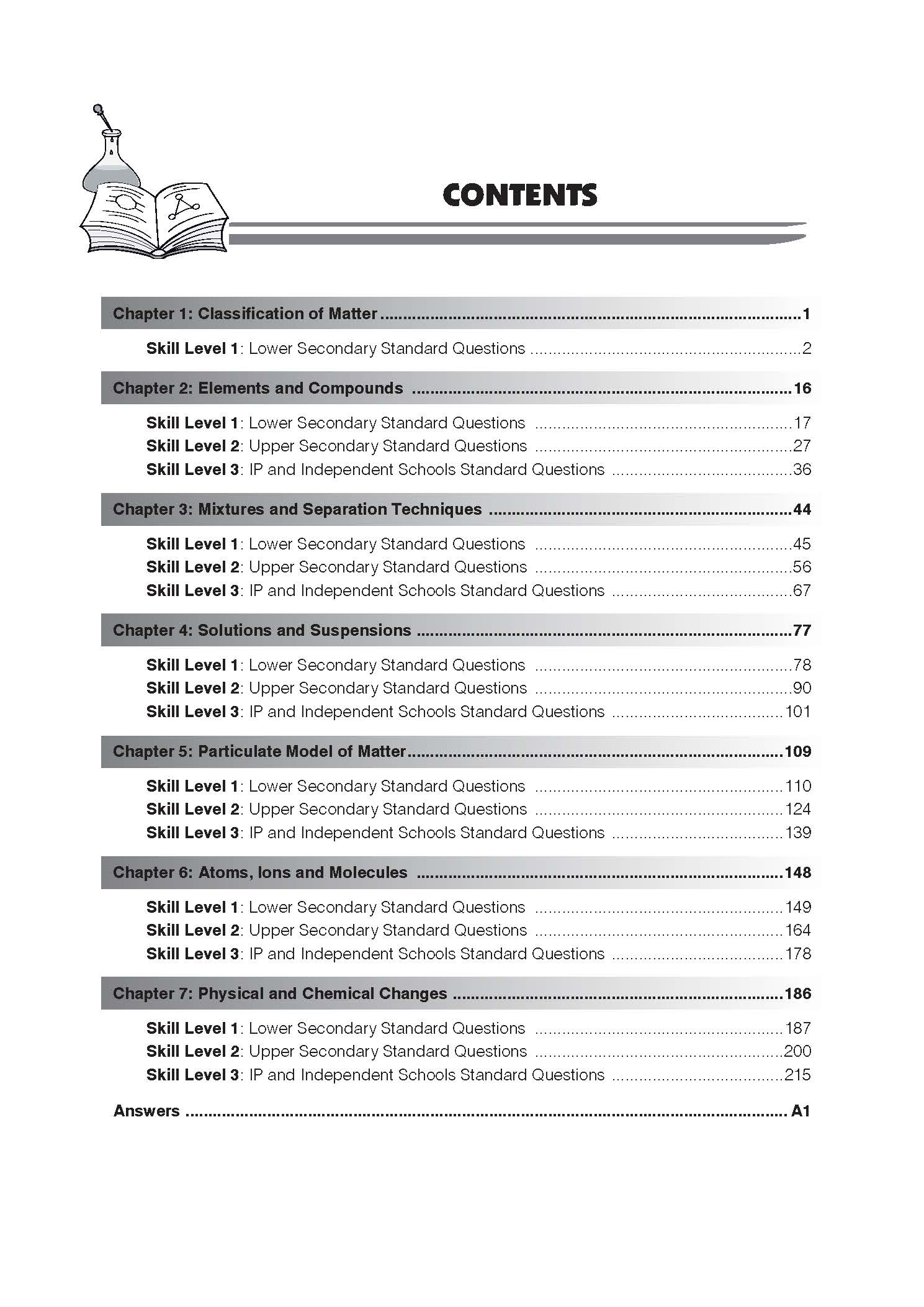 The series comprises three books: Physics, Chemistry and Biology. Questions for each chapter are allocated into three Skill Levels. Skill Level 1 Lower Secondary Standard Questions The questions in Skill Level 1 are written in accordance to the latest MOE Lower Secondary Science syllabus implemented in 2008. Questions at this level will test only the basic fundamental concepts and process skills in Lower Secondary Science. These include representatives of questions that frequently appear in school examinations. Skill Level 2 Upper Secondary Standard Questions Questions in Skill Level 2 are pitched at a higher standard and journey beyond the Lower Secondary Science syllabus. The questions at this level test concepts and process skills at the upper secondary standard and also include high frequency model questions that appear in school examinations. Skill Level 3 IP and Independent Schools Standard Questions This is the highest skill level with complex questions that are benchmarked by the standards of the science syllabuses of schools offering the Integrated Programme (IP) and the independent schools. As you traverse through the questions in the three books, it is recommended that you begin with the first skill level and work your way up, gradually developing your mastery of each chapter. This book represents only a sample of the Lower Secondary Science curriculum in Mavis Tutorial Centre.