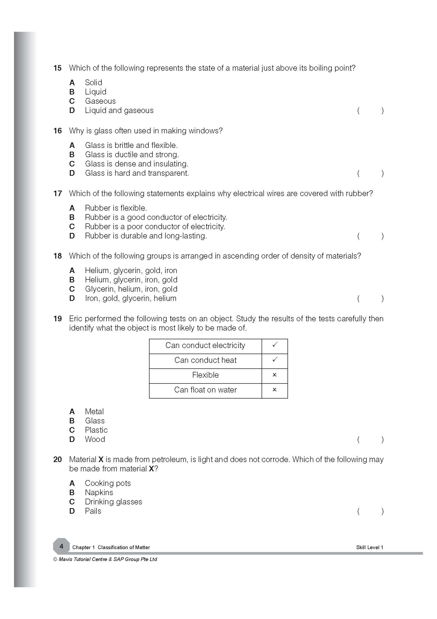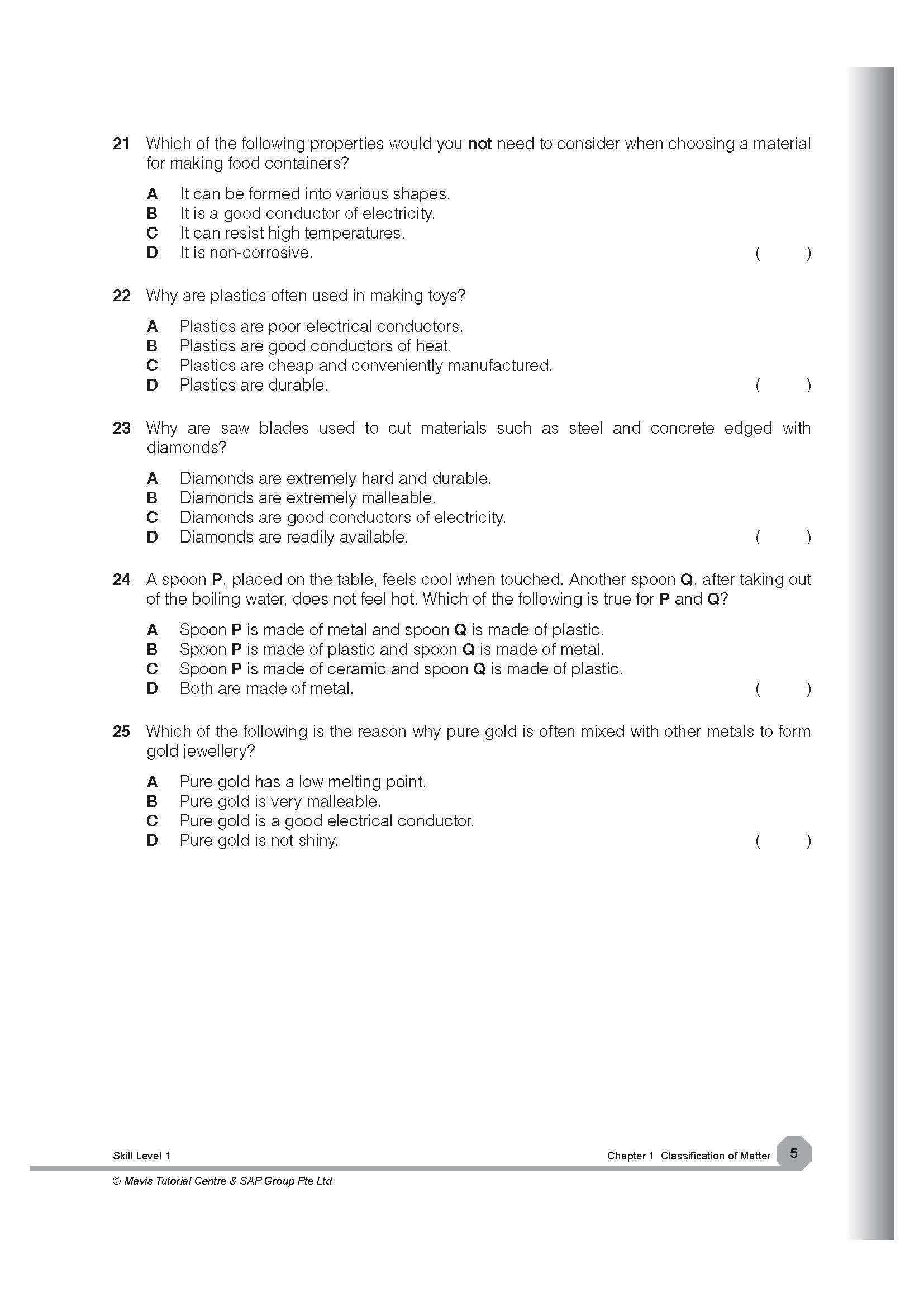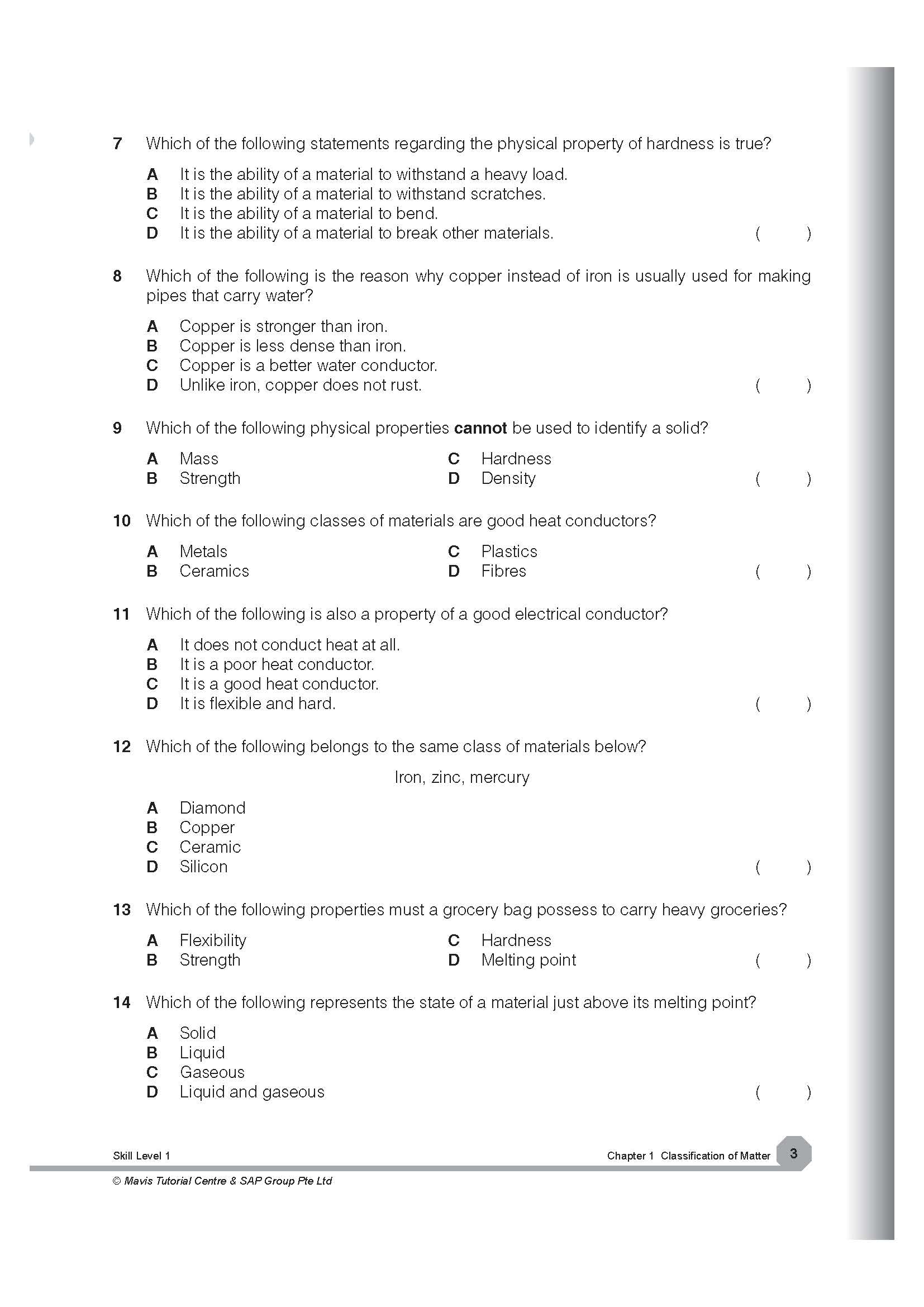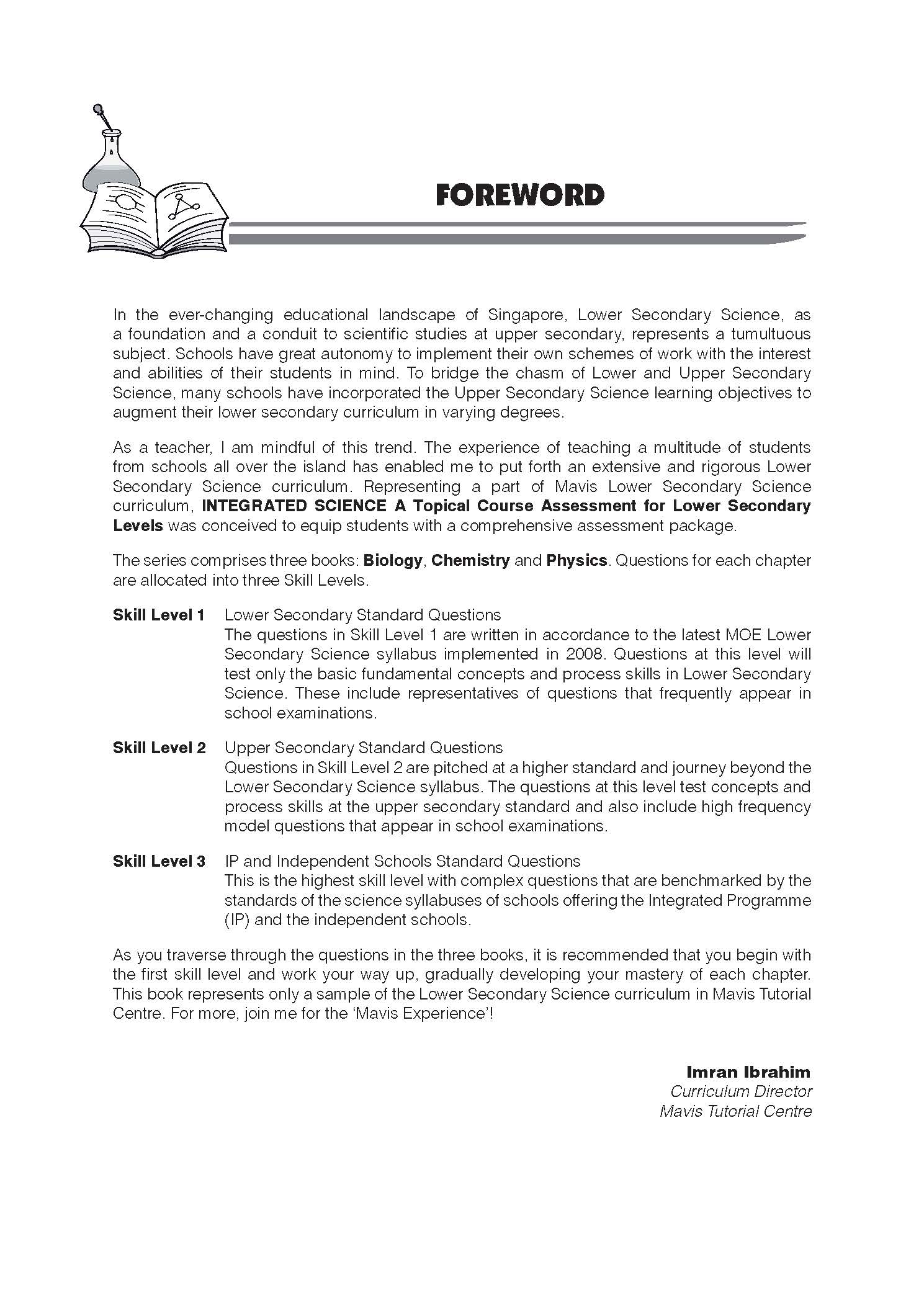 The series comprises three books: Physics, Chemistry and Biology. Questions for each chapter are allocated into three Skill Levels. Skill Level 1 Lower Secondary Standard Questions The questions in Skill Level 1 are written in accordance to the latest MOE Lower Secondary Science syllabus implemented in 2008. Questions at this level will test only the basic fundamental concepts and process skills in Lower Secondary Science. These include representatives of questions that frequently appear in school examinations. Skill Level 2 Upper Secondary Standard Questions Questions in Skill Level 2 are pitched at a higher standard and journey beyond the Lower Secondary Science syllabus. The questions at this level test concepts and process skills at the upper secondary standard and also include high frequency model questions that appear in school examinations. Skill Level 3 IP and Independent Schools Standard Questions This is the highest skill level with complex questions that are benchmarked by the standards of the science syllabuses of schools offering the Integrated Programme (IP) and the independent schools. As you traverse through the questions in the three books, it is recommended that you begin with the first skill level and work your way up, gradually developing your mastery of each chapter. This book represents only a sample of the Lower Secondary Science curriculum in Mavis Tutorial Centre.