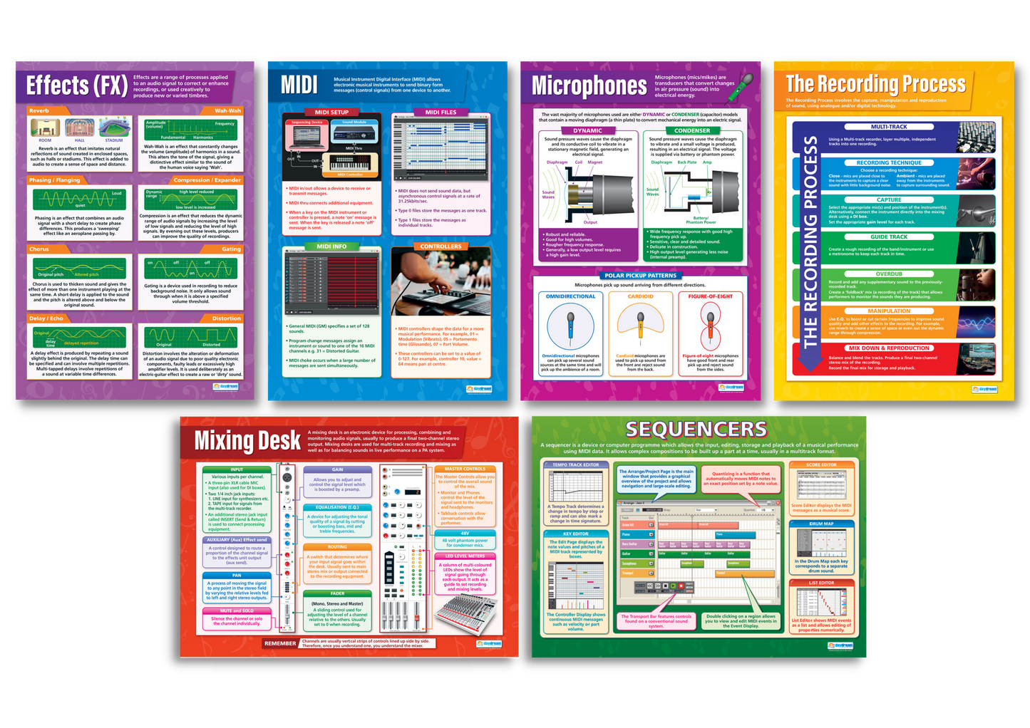 This 6-poster set explores a wide range of music technology topics, making it the perfect resource for Music teachers, studios, and schools. Captivate students with vibrant colours, clear explanations, and engaging visuals, transforming classrooms and studios into vibrant hubs for musical exploration and technical understanding.