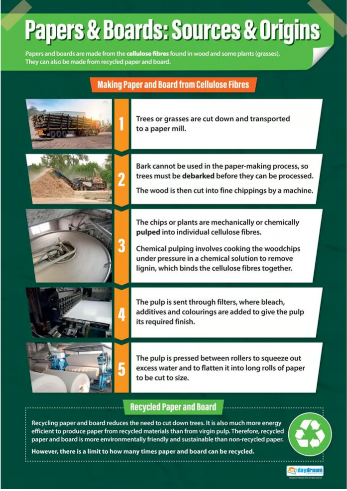 The chart also introduces the importance of recycled paper and board, helping students understand environmental sustainability, energy use and the limitations of recycling cycles. Each step is illustrated with real-world imagery, making the topic easier to visualise and understand during theory and practical lessons.