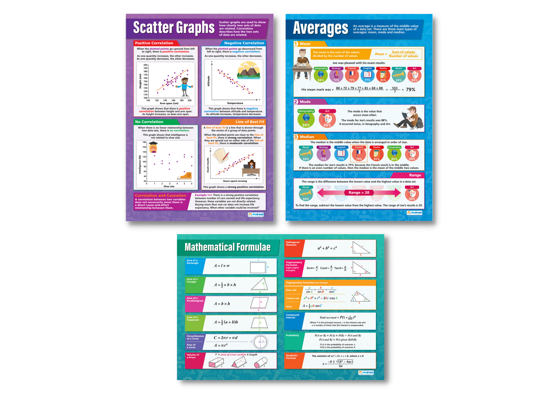This dynamic 3-poster set tackles critical Probability and Statistics concepts, making it the perfect visual aid for Maths teachers in schools. Captivating students with vibrant colours, clear explanations, and engaging visuals, these informative posters transform abstract data into a world of meaning and analysis.