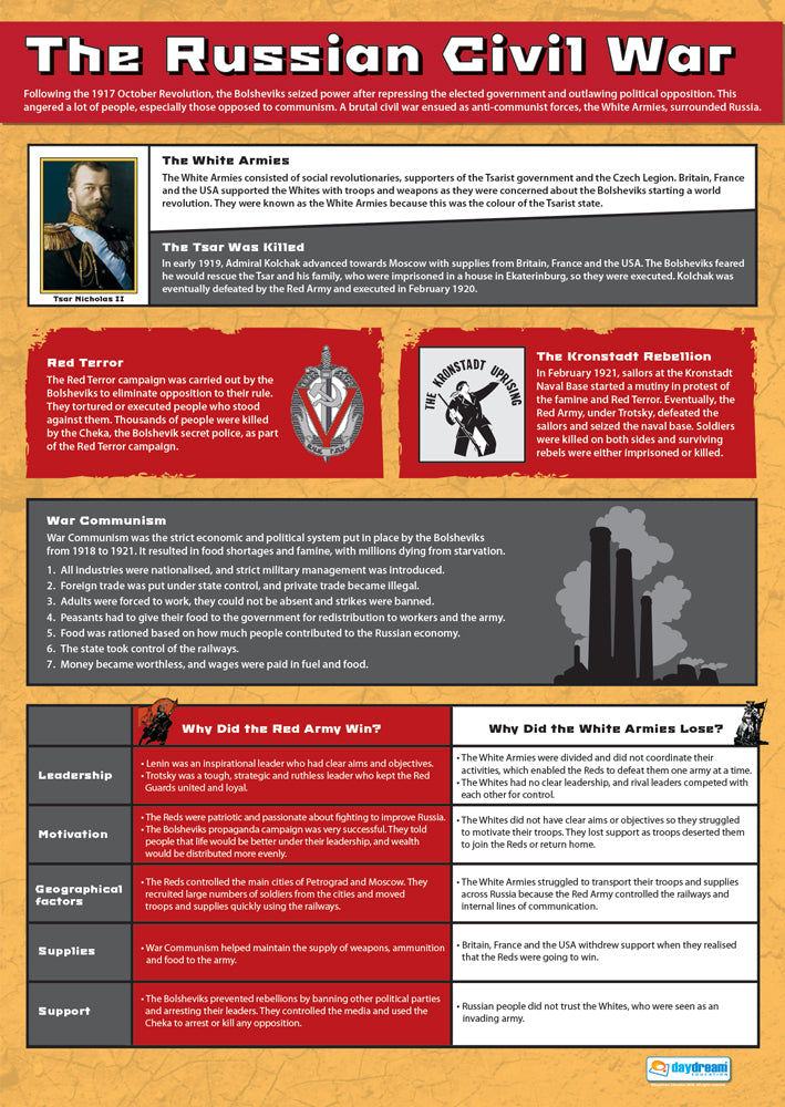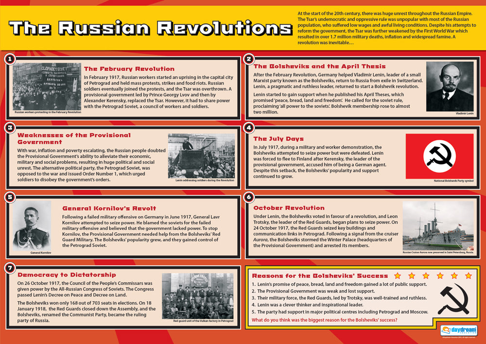 This focused 3-poster set delves into the key events that reshaped Russia during this pivotal period, making it the perfect resource for History teachers and schools. With captivating visuals, clear explanations, and a large, A1 size for exceptional readability, these informative posters transform classrooms and hallways into vibrant hubs for historical exploration and critical analysis.